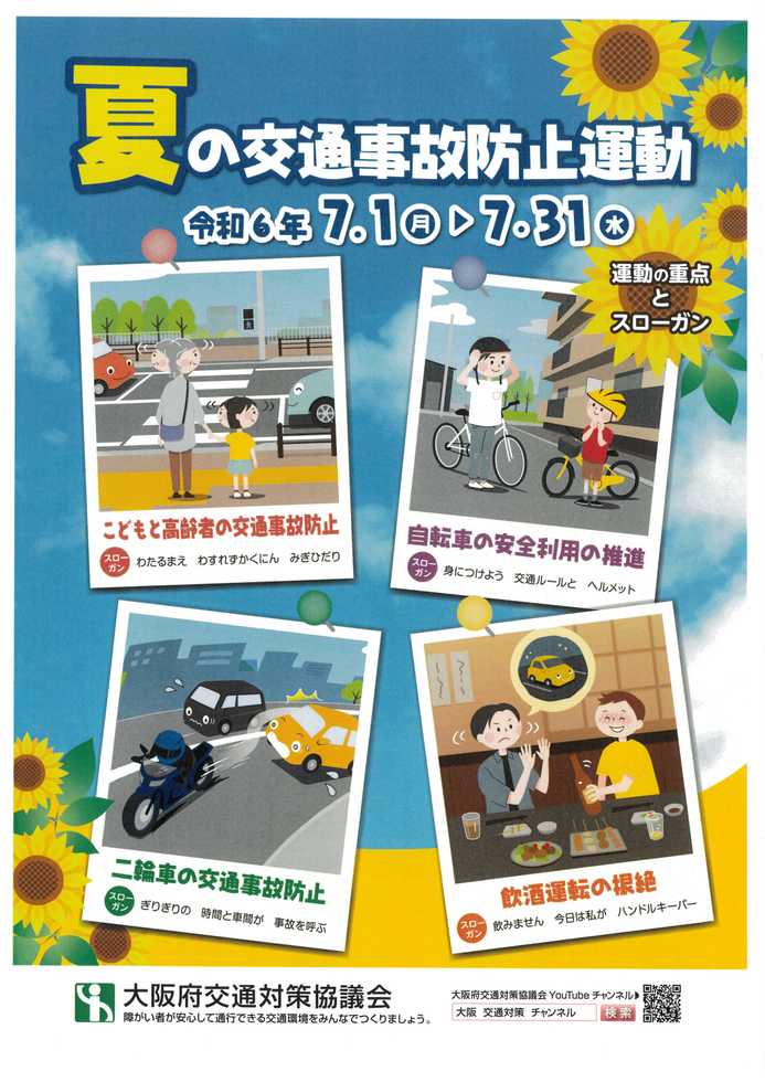夏の交通事故防止運動は、夏の行楽期を控え、広く府民の皆さんに交通安全思想の普及・浸透を図り、交通ルールの遵守と正しい交通マナーの実践を習慣づけていただくことにより、交通事故防止の徹底を図ることを目的に実施されるものです。