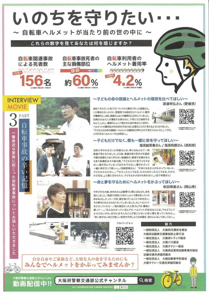 大阪府下における自転車利用者の交通事故を1件でも多く減らすため、また、皆さんが交通事故に遭わないためにも、交通ルールを遵守するとともに、正しい交通マナーを実践していただきたいと思います。